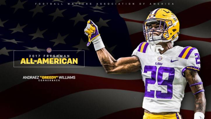 January 9, 2018January 9, 2018 LSU Football Report Williams Named to FWAA Freshman All-America Team Greedy Williams added another honor to his list of 2017 accomplishments as the LSU rookie earned a spot on the Football Writers Association of American Freshman All-America team, the organization announced. Share this: Click to share on Facebook (Opens in new window) Facebook Click to share on LinkedIn (Opens in new window) LinkedIn Click to share on X (Opens in new window) X More Click to email a link to a friend (Opens in new window) Email Click to print (Opens in new window) Print Click to share on Reddit (Opens in new window) Reddit Click to share on Tumblr (Opens in new window) Tumblr Click to share on Pinterest (Opens in new window) Pinterest Click to share on Pocket (Opens in new window) Pocket Click to share on Telegram (Opens in new window) Telegram Click to share on WhatsApp (Opens in new window) WhatsApp Like Loading... Related