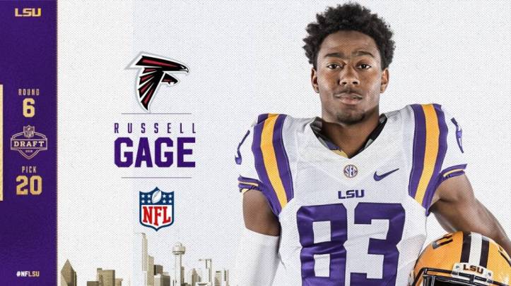 Wide receiver Russell Gage was the first of three LSU players selected on the final day of the 2018 NFL Draft when he was selected by the Atlanta Falcons with the No. 194 pick Saturday. Gage will join former Tigers Deion Jones and Duke Riley.